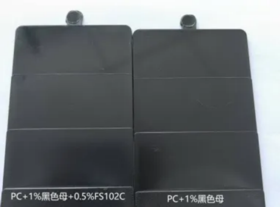 在PC原料體系中添加0.5%CYD-FS102C,290℃注塑,樣板表面無銀紋,無析出,耐溫效果好。